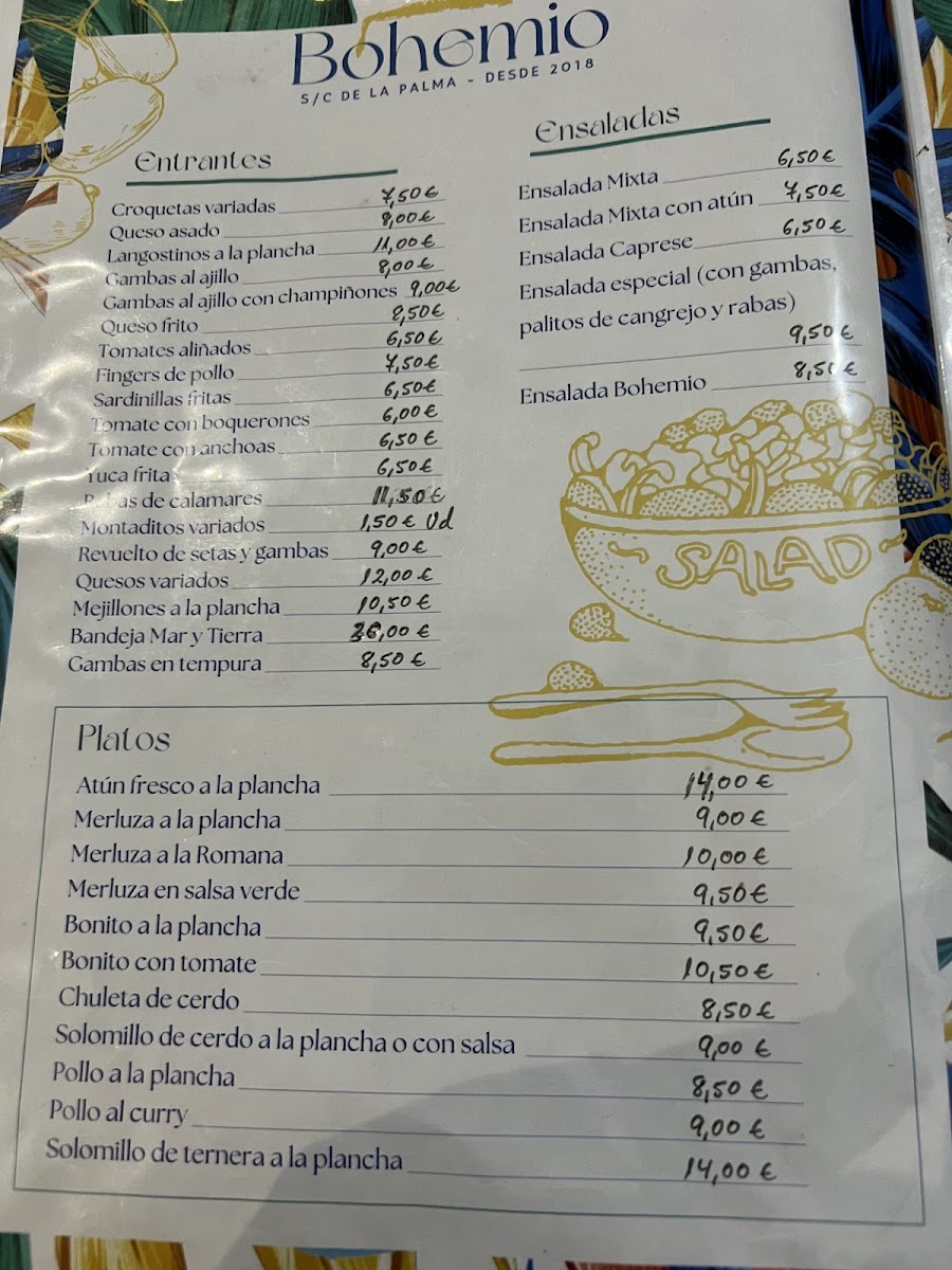 The menu at Cafe & Bar Bohemio features a variety of food and drink options typical of a local cafeteria and tapas bar. Guests can expect a selection of beverages including classic cocktails such as mojitos and sangria, as well as specialty coffee drinks like barraquito. The food offerings cover a range of light meals and snacks, with items like chicken wings, sardines, and various salads including Ensalada Especial and Salade Mixte et Tomate.