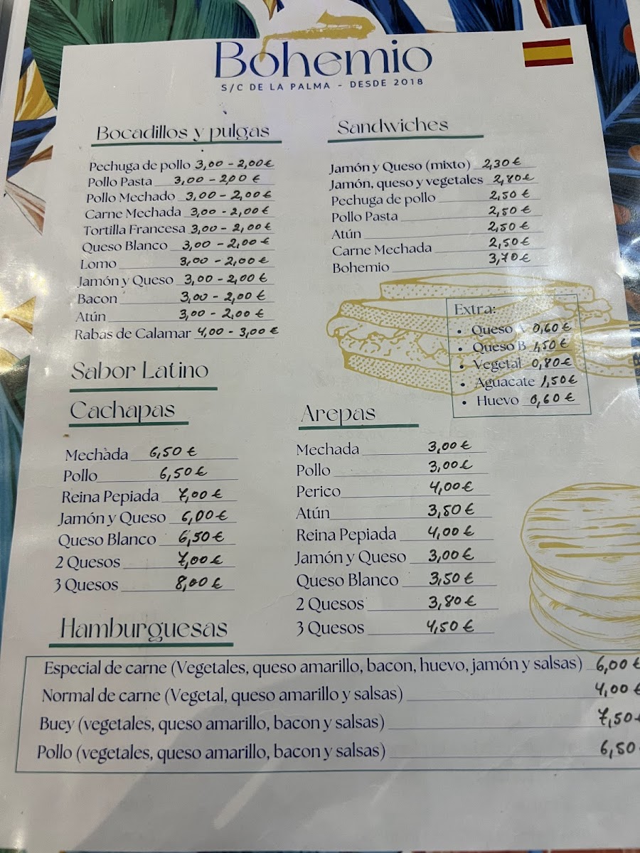 Additionally, the menu includes traditional dishes such as cachapa de carne mechada, revuelto de setas y gambas, and barrakito canario, alongside desserts like helado de vainilla. The menu is structured to accommodate casual dining experiences, suitable for coffee breaks, light meals, or shared tapas-style ordering.